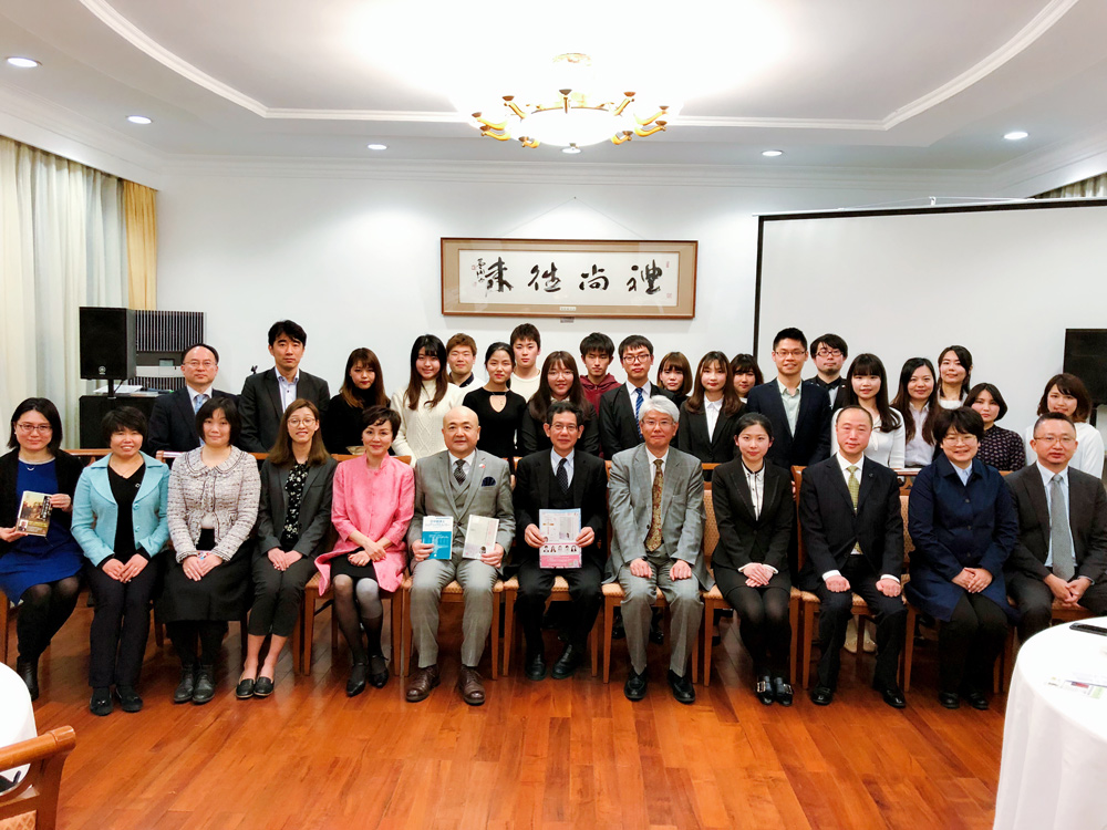 2018年3月23日,日本驻上海领事馆片山和之总领事在领事馆内举行了与上海周边“第十三届中国人日语作文大赛”获奖的部分高校日语专业学生的交流会,91短视频 日语专业15级马滢哲(三等奖获得者)、赵淑婷(佳作奖获得者)和16届毕业生朱杭珈(三等奖)三位同学应邀前往。