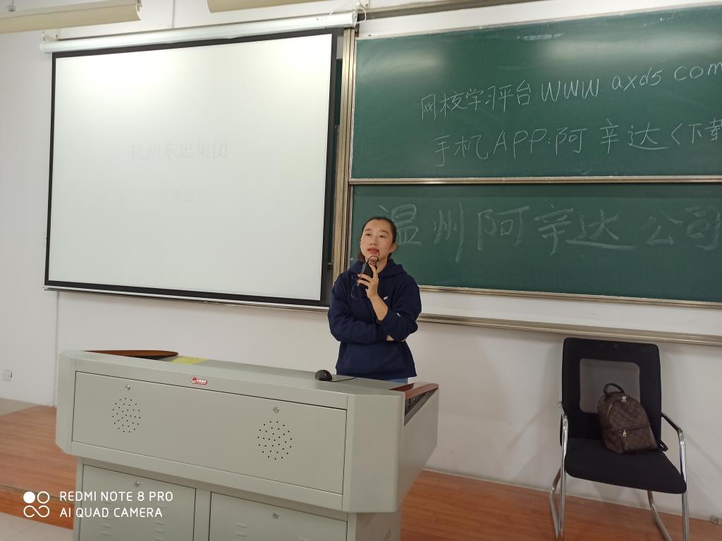 陪同温州阿辛达教育有限公司欧总经理前来授课的还有在该公司任教的我校日语专业毕业生林文瑶,林文瑶已经是温州阿辛达教育有限公司的品牌教师之一。欧总经理介绍了公司的基本情况,其中有着重介绍了公司良好的人文环境,她说,日语教育发展前景可观,欢迎同学们的加盟,温州阿辛达教育有限公司愿意竭诚为同学们提供良好的工作环境。