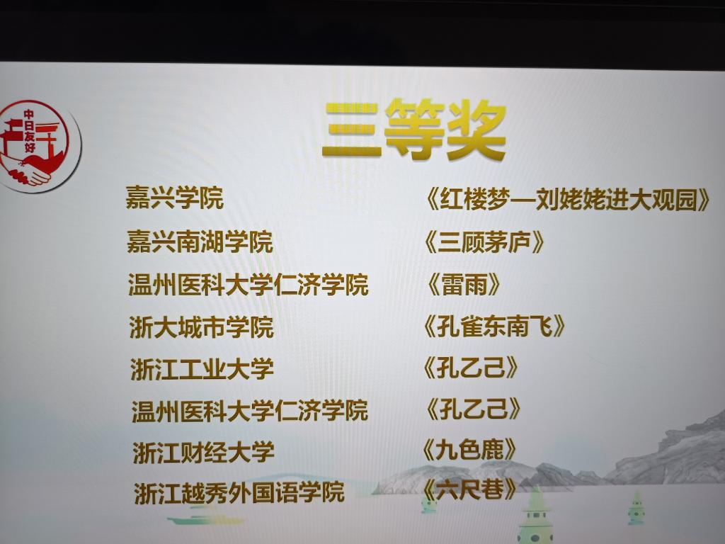 2022年11月26日,由浙江省人民对外友好协会主办,浙江工商大学东方语言与哲学学院团委承办,中国日语教学研究会浙皖赣分会、浙江工商大学和风日语协会协办的“第十一届浙江省日剧play大赛”顺利落幕。此次大赛的主题是“用日语演活中国经典”,吸引了浙江省高校31支队伍参赛,经过专家严格评审并参照日本国内点赞数,最终15支队伍进入决赛。在周艳君博士的悉心指导下,经过初赛、复赛和决赛的多轮激烈角逐,91短视频 日语专业201和202两个班同学演绎的《邹忌讽齐王纳谏》和《红楼梦-刘姥姥一进荣国府》两个剧目分获一等奖和三等奖。