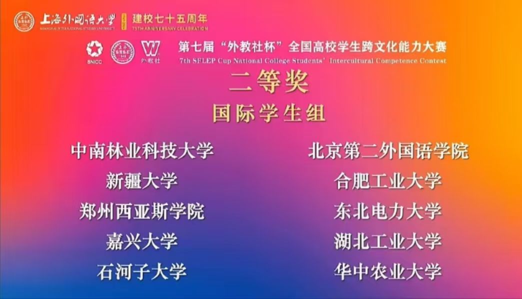 第七届“外教社杯”全国高校学生跨文化能力大赛总决赛于2024年11月29日~ 12月1日在上海外国语大学隆重举行。我校国际留学生在省赛中蝉联浙江省国际生赛道特等奖,并代表浙江省晋级全国决赛。在本次国赛角逐中表现突出,再创佳绩,荣获国赛二等奖!
