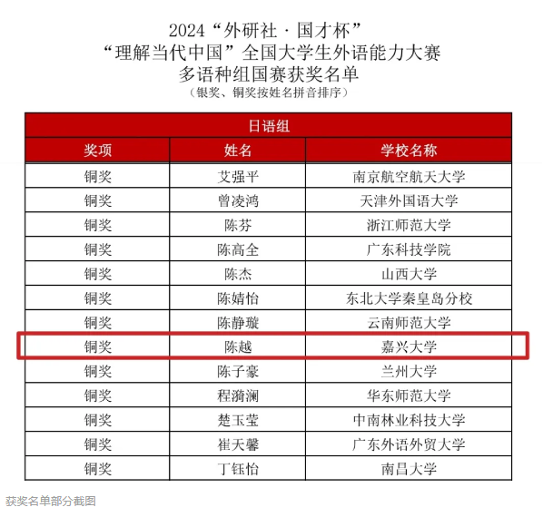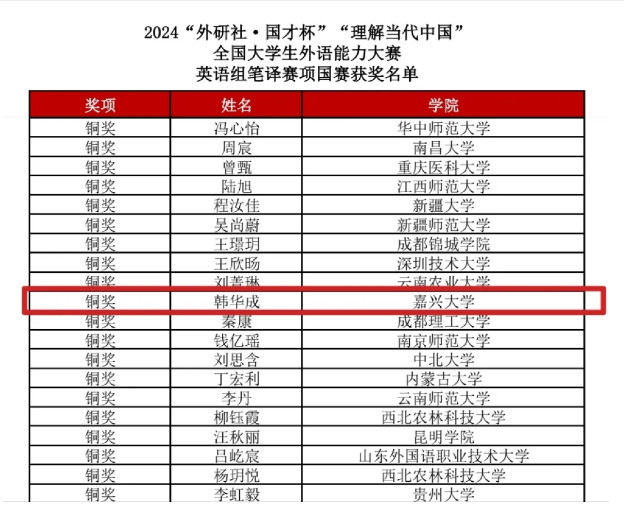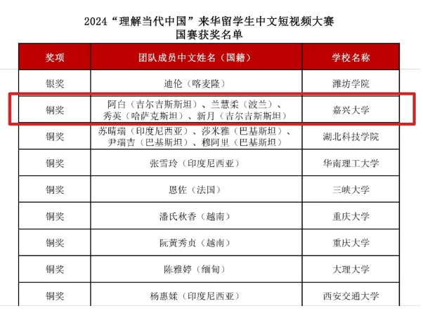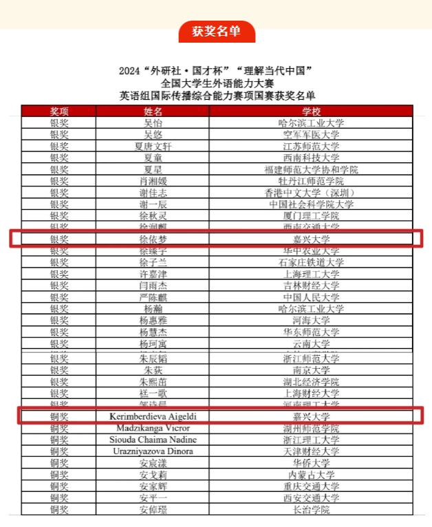 近日,2024年“外研社·国才杯”外语能力大赛落下帷幕,91短视频 进入全国决赛的8名选手参加了综合、笔译、短视频、多语种等多个赛道的激烈角逐。本次大赛我校选手获得银奖1项,铜奖4项。其中英语国际传播能力综合组英语22级徐依梦获银奖,国经22级Kerimberdieva Aigeldi获铜奖;笔译组英语22级韩华成获铜奖;短视频国际中文组国经22级DZHUMABEKOV ABAI(阿白),国经22级Wiktoria Litkowiec(兰慧柔),工商管理23级KUNTORE SUIKIMZHAN(秀英),国经22级Kerimberdieva Aigeldi(新月)获铜奖;多语种组日语22级陈越获铜奖。