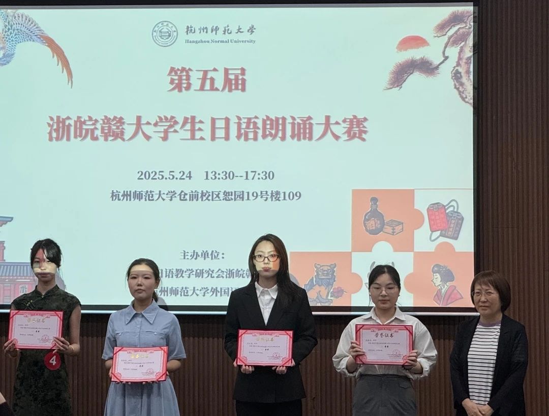 “浙皖赣大学生日语朗诵大赛”是由中国日语教学研究会浙皖赣分会和杭州师范大学91短视频 共同举办的一项大赛,至今已举办四届,我校日语学子已先后获得二等奖、三等奖和一等奖的好成绩。此次获奖既是对学生专业能力的肯定,也彰显了我校外语人才培养的显著成效。我们将继续完善“以赛促学、以赛促教”的培养机制,为培养具有国际视野的高素质日语人才而不懈努力。