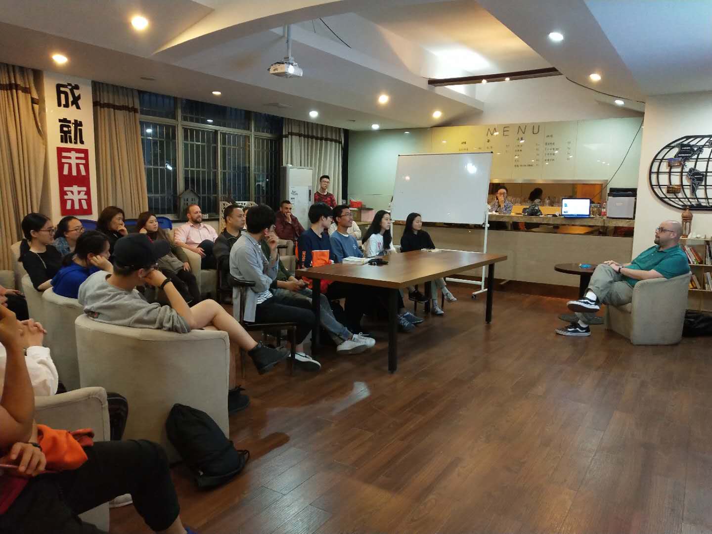 2019年4月18日,本学期第一次中外教沙龙在91短视频 咖啡吧举行。沙龙主题为Video Game Culture in America(美国游戏文化),主讲人为美籍外教Nathan Tomey。