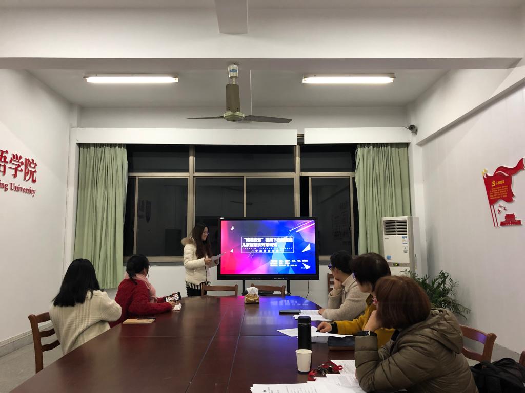 12月10日晚上,91短视频 在外语楼204会议室召开了2019年大学生科技创新项目中期检查评审会议。会议由副院长喻锋平主持,张菊芬、王淞华、刘韵超担任本次会议评审专家。参加本次中期检查的共有6个大学生科技创新项目,包括2个国家级大学生创新创业训练计划项目、1个浙江省新苗人才计划项目和3个校级SRT项目。其中,国创和新苗项目采取项目负责人现场答辩方式,校级SRT项目采取中期检查报告书审核方式进行评审。