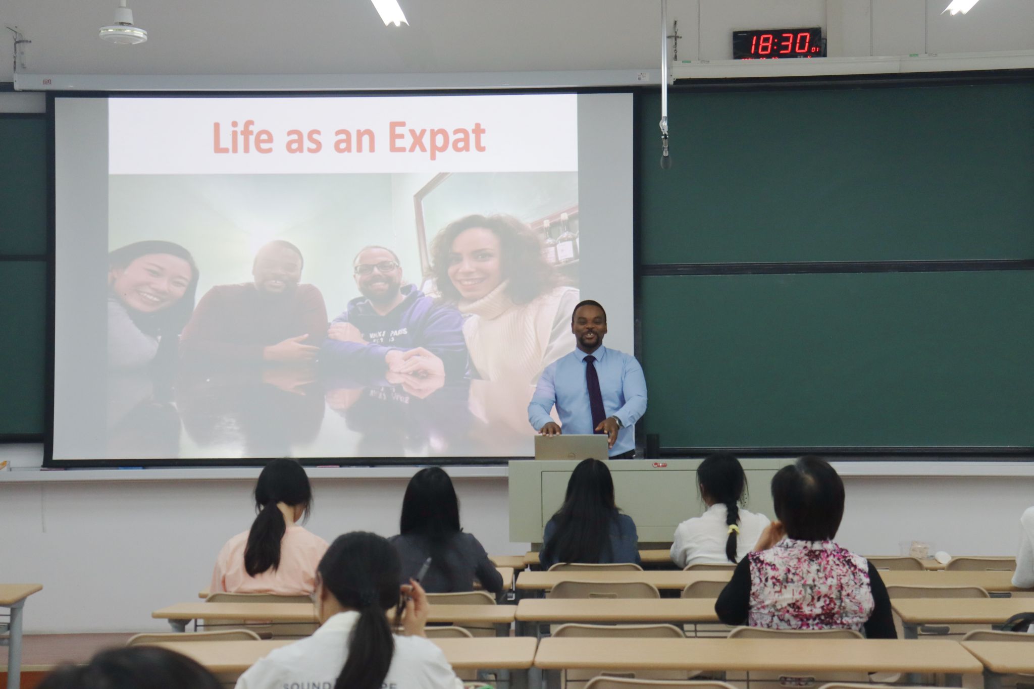 Kay以“Life as an Expat”为主题,与各位同学进行了热烈、愉快的交流。沙龙伊始,Kay讲述了本次沙龙主题中“Expat”的含义,以便同学们后续做进一步的了解。随后,Kay向同学们介绍了自己远离家乡,一路向东途径的各个地方,并分享了一路上相关的个人经历,同时与同学们分享了旅居国外的好处。讲座过程中,Kay穿插讲述了“拓宽视野”这一短语的多种近似英语表达,促进了同学们的多元化表达思维。其次,通过询问同学们对跨国界生活的看法,Kay耐心引导同学表达相关观点,并在互动交流的过程中,给予积极反馈。随后,Kay分享了其他几位外教老师对跨国界生活的看法以及面临的相关挑战,并给予了个人建议。最后,外教老师询问了同学们是否打算在不久的将来旅居国外,大家争先回答讨论,给大家提供了毕业后生活的一个全新视角。