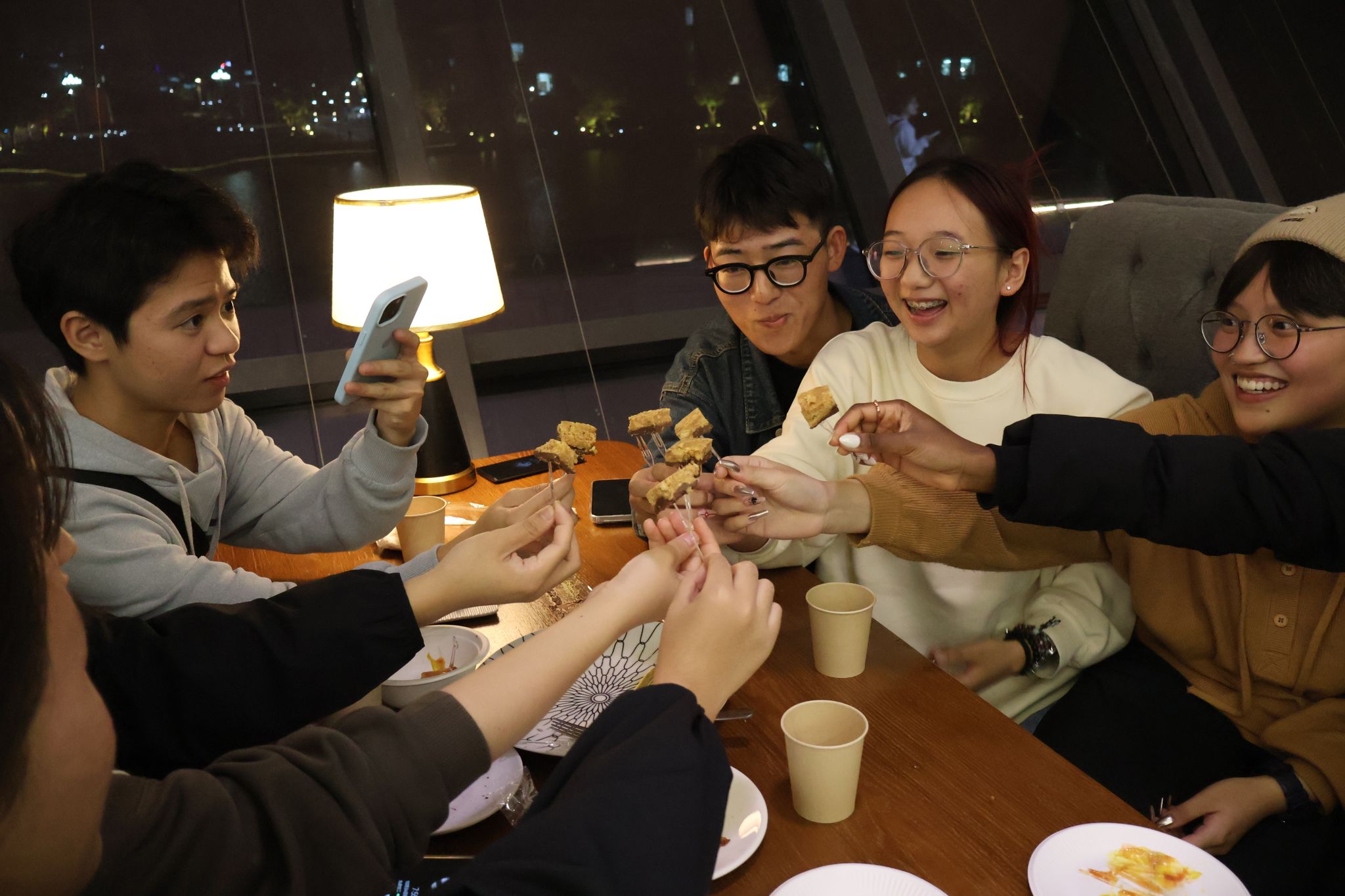 随后,外教Nathan老师介绍了西方万圣节期间家庭糖果的制作,并与大家分享了他的巧克力花生酥,还慷慨地附赠了他们家的“祖传秘方”。一时间,“小吃货”们在美食的驱使下,纷纷跃跃欲试,想要上前介绍自己的家乡美食。在交流环节,外教Kay老师组织同学们进行小组讨论,他通过猜词游戏,引发了大家对美食与地域文化的思考。同学们纷纷表示,这次外语角不仅学到了新的英语词汇、提升了英语交流与运用能力,还增进了彼此的友谊,也进一步增强了他们对英语学习的兴趣与信心,丰富了大家的校园生活。