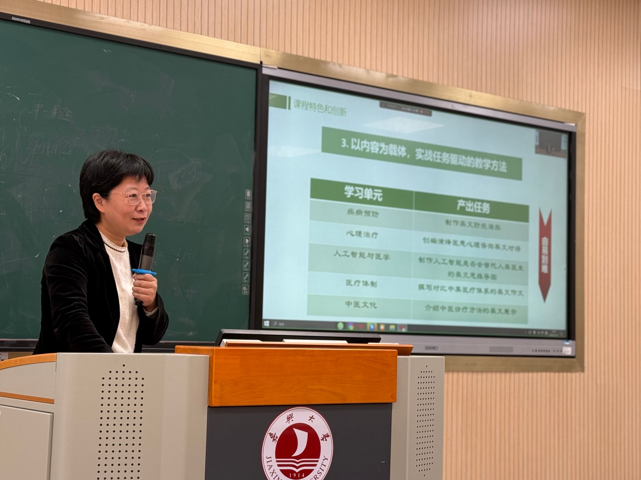 吴嫣斐老师以“用‘语言’赋能‘生命之花’的绽放——大学英语(医学)一流课程建设经验分享”为题,介绍了《大学英语(医学)》的课程概况、课程建设、课程特色和创新,并作课程未来展望。其中,吴老师重点分享4C课程思政创新体系建设、课程-模块-内容三级体系构建、以内容为载体,实战任务驱动的教学方法、技术赋能等课程特色和创新举措。建设这一具有生命力的课堂,极大地激发学生学习的主动性和参与性,也体现了教师在该课程教学中的创新性。
