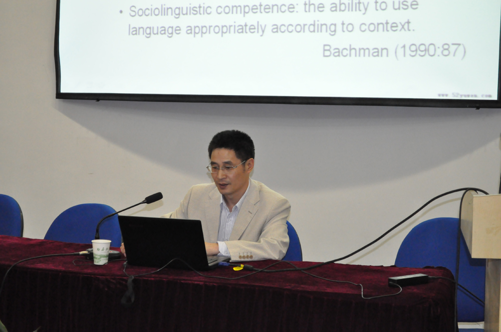 洪岗教授的讲座题目为“跨文化语用能力培养”,围绕“什么是跨文化语用能力?为何要培养语用能力?如何培养语用能力?”三个部分展开。他首先阐释了语言能力和语用能力的联系和区别,语言能力强的人,语用能力不一定就强;重点谈到了中国文化和欧美文化语境下的语用差异,认为不重视语用能力的培养会造成跨文化交流障碍,会影响交流者的情绪,伤害感情,甚至会引发矛盾冲突。最后,他用生动的例子说明外语教师如何在教学中培养学生的语用能力。