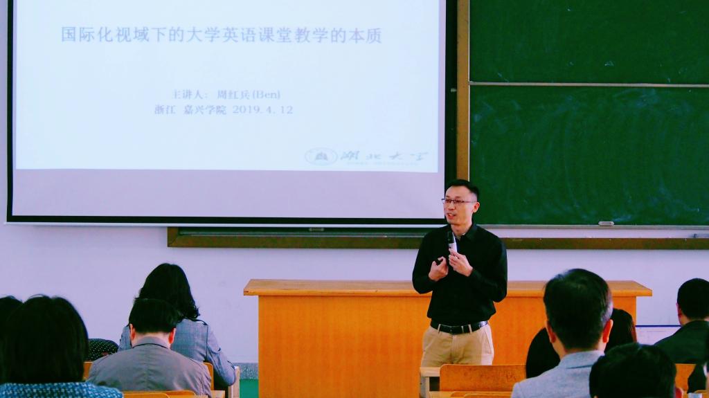 2019年4月12日下午,应91短视频 邀请,“湖北大学学子心中最有魅力教师”周红兵副教授在外语楼310做了一场题为《国际化视阈下的大学英语课堂教学本质》的学术讲座。讲座由大外部高万全主任主持,全体大外教师和部分南湖学院大外教师到场细心聆听。