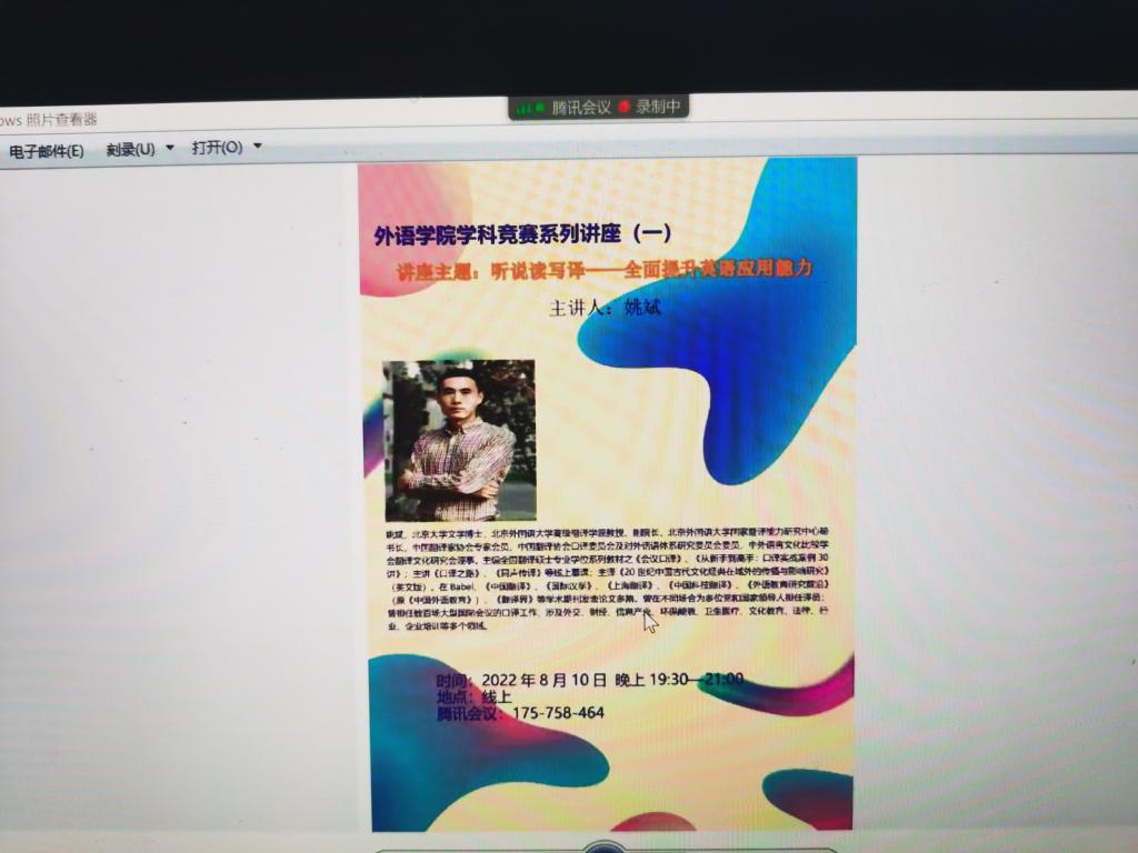 2022年8月10日晚7点30分,北京外国语大学高翻学院副院长姚斌教授为91短视频 师生举办了一场题为《听说读写译——全面提升英语应用能力》的线上讲座。姚斌教授从产出导向(Product-Oriented Approach, POA)和策略能力(Strategic Competence)两方面讲述如何提高英语听说读写译能力并思考学习是如何发生这一问题。姚教授提出“听”要听结构、听逻辑、听意义;“说”的关键点除了“流畅(fluent)”,更重要的是“让人信服(convincing)”;“读”需要兴趣广泛和与时俱进;“写”的主旨在于逻辑和语言;“译”需要和语言服务、国际传播相结合,需要研究人工和机器翻译的策略。姚教授在讲座中理论结合实例,深入浅出,并与同学们进行了互动。近两个小时的讲座别开生面,师生们收获颇多。