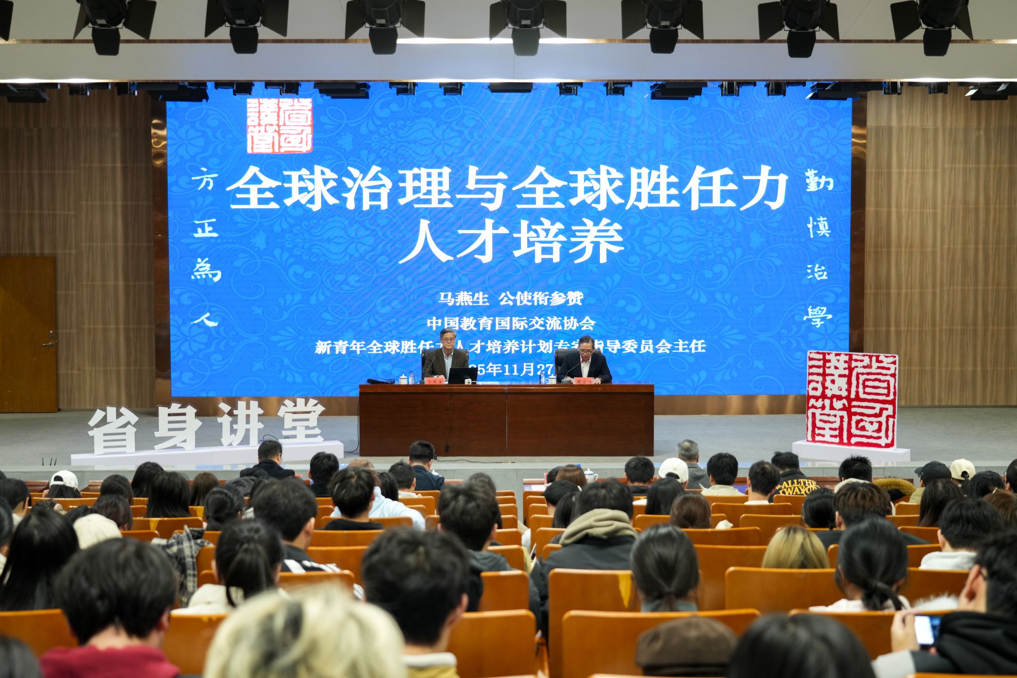 11月27日,中国教育国际交流协会新青年全球胜任力人才培养计划专家指导委员会主任、中国驻法国使馆教育处原公使衔参赞马燕生应邀作客我校省身讲堂第152讲,作题为《全球治理与全球胜任力人才培养》的报告。副校长周宏伟主持报告会。