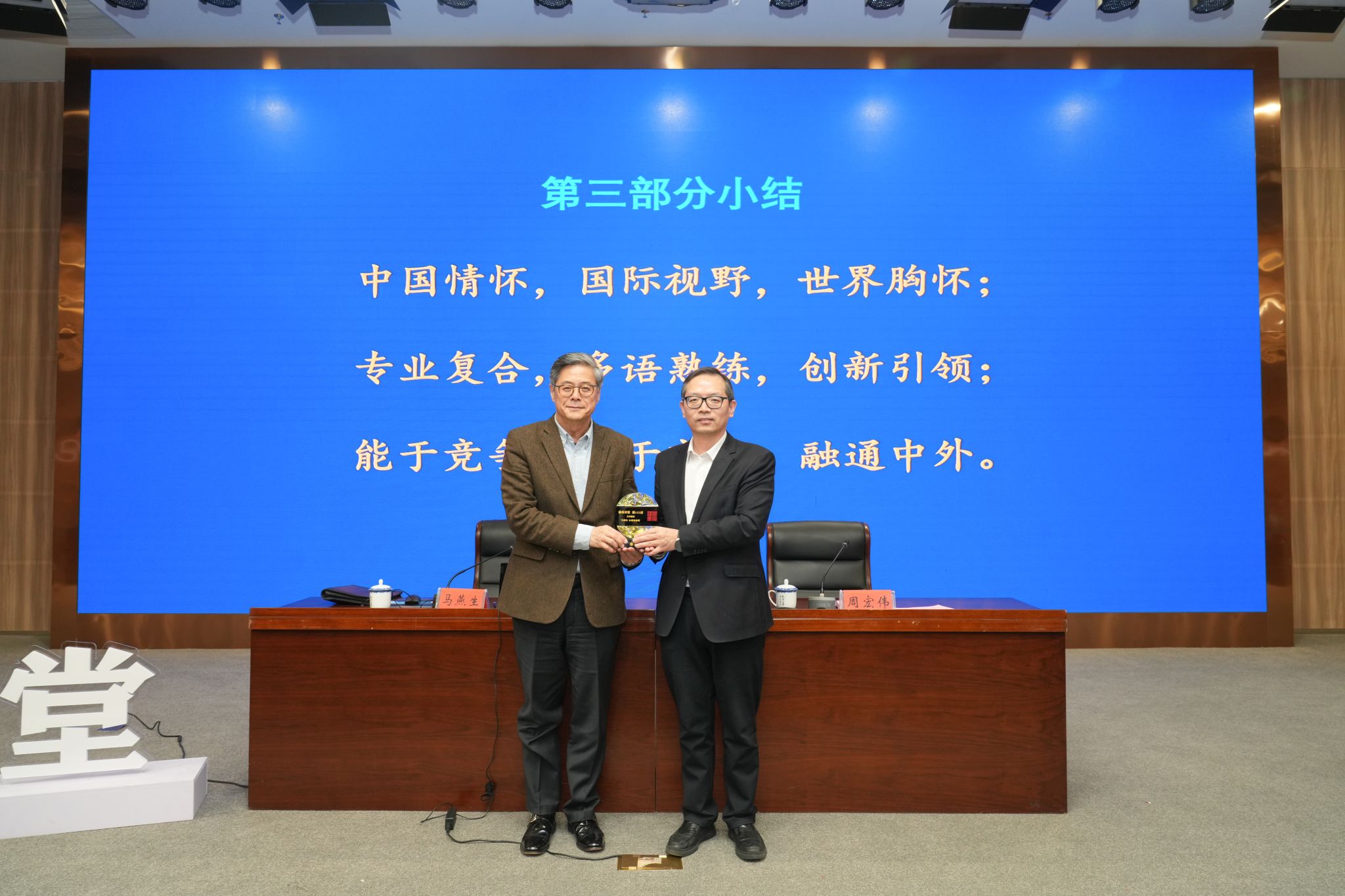 报告结束,周宏伟代表学校向马燕生赠送省身讲堂纪念杯。