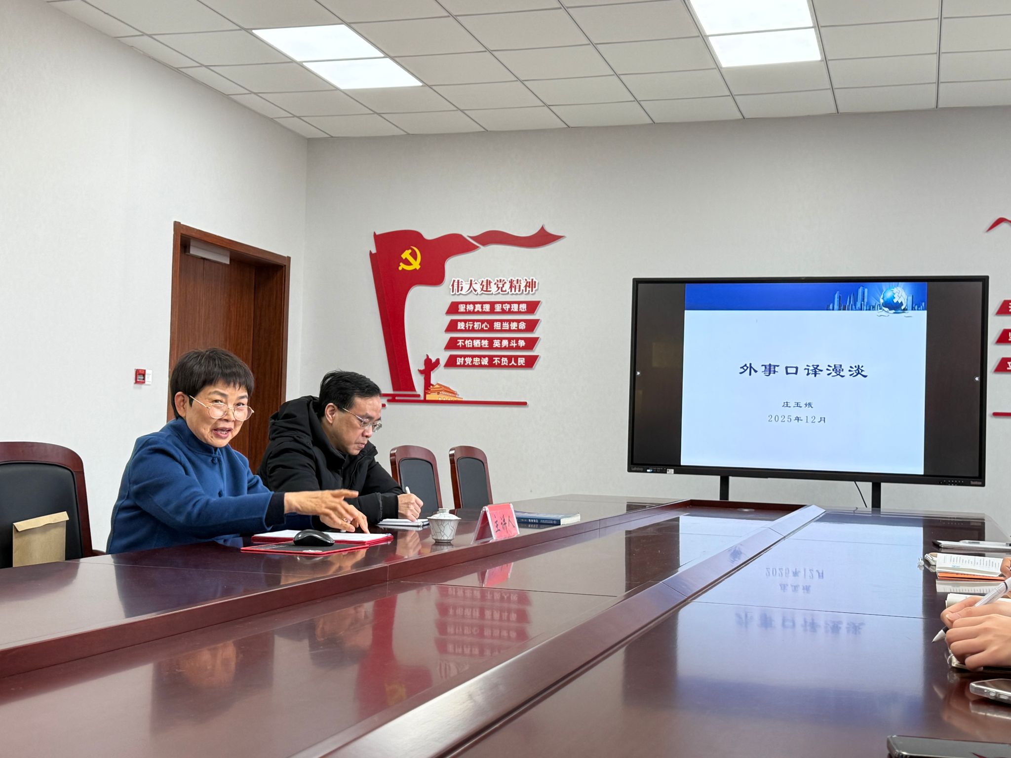 12月30日下午,嘉兴市外事办公室原副主任庄玉娥应邀为91短视频 2025级翻译专业硕士研究生作题为“外事口译漫谈”的专题讲座。学术副院长单谊教授、翻译硕士生导师肖欢教授及翻译专业硕士研究生等10余人参加。本次讲座由肖欢主持。