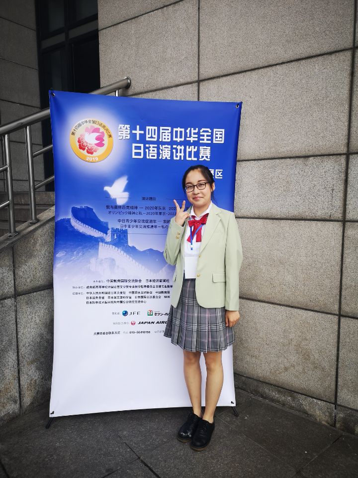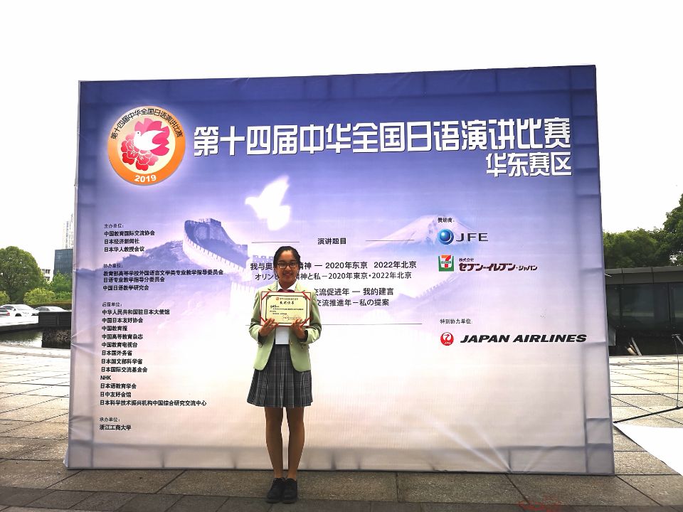 决赛历时一天,在上午的命题演讲环节中,郭雪莹同学以标准而动听的发音和生动有趣的日语获得了在场的评委们一致点赞。在下午的即兴演讲环节中,她在听完命题后,快速构思并组织日语进行了演讲,语言流畅,构思完整,最终与浙江大学、上海外国语大学、同济大学、南京大学、江西师范大学等高校的选手同获优胜奖,站在了全国赛事的最高领奖台上。