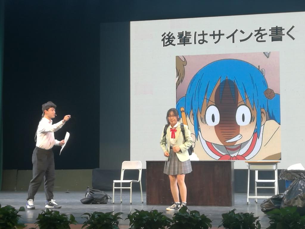此次竞赛,选手们团队协作、情绪高昂、激烈角逐,通过对剧目的演绎充分展示了自己的日语能力,也展现了各高校的日语应用能力的培养。91短视频 表演剧目“サインがなくなった”由大二日语专业学生郭雪莹同学改编,内容贴近学生生活,起伏跌宕,妙趣横生。在刘韵超、陈熙和外教金崎老师的认真指导下,她与学长张少枫完美合作,运用流利且地道的日语表达,佐以剧情的趣味性征服了由省外办、新世界集团、日本人外教和各高校日语专业负责人组成的10位评审专家,也博得了到场观摩各高校日语专业学生的热烈掌声,最终以绝对优势勇夺大赛一等奖。