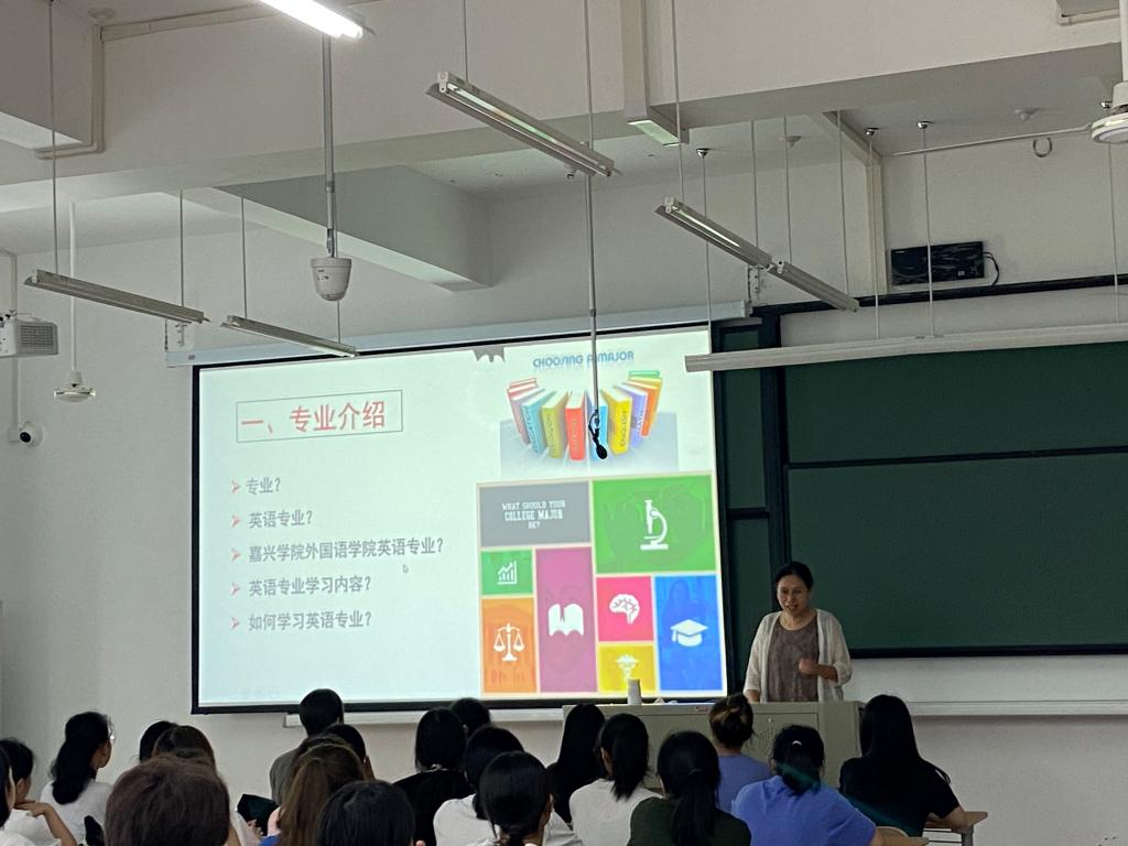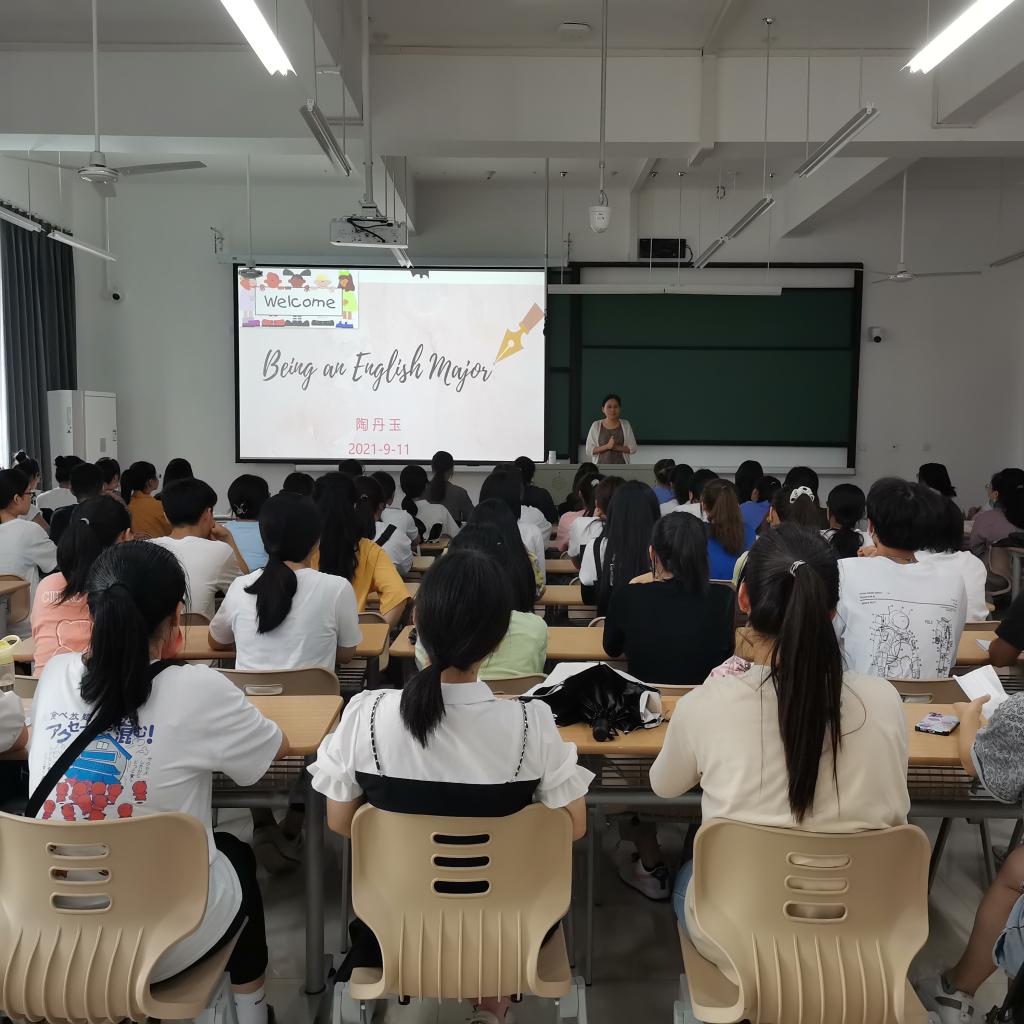 9月11日上午,新生入校始业教育的第二天,91短视频 英语专业负责人陶丹玉教授以“Being an English Major”为题在兴德南楼203教室为全体英语专业2021级新同学上了第一堂专业入门课。