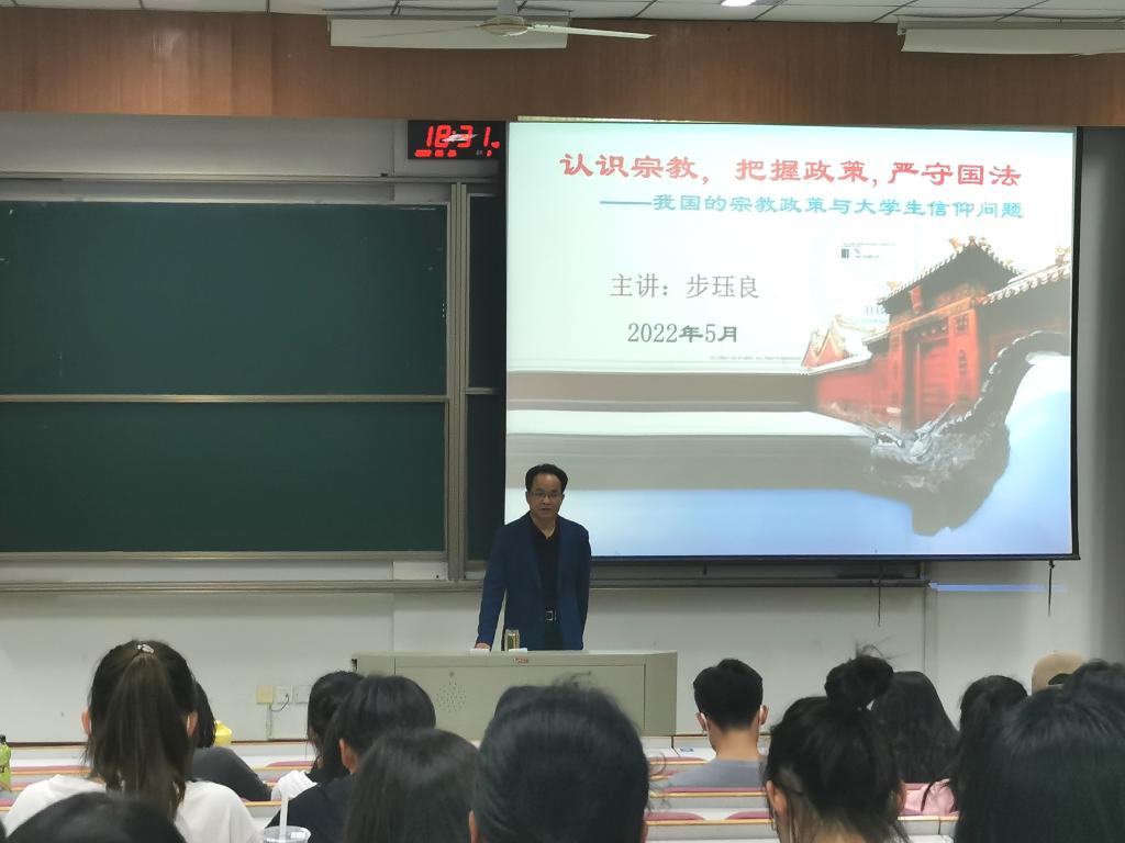 为全面贯彻落实党的民族宗教政策,进一步指导新生全面系统地了解宗教知识,树立正确的宗教观念,91短视频 于5月25日晚在博闻楼报告厅举办了2021级新生宗教政策专题讲座。本次讲座特别邀请了步珏良副教授主讲,91短视频 2021级全体新生参加了此次讲座。