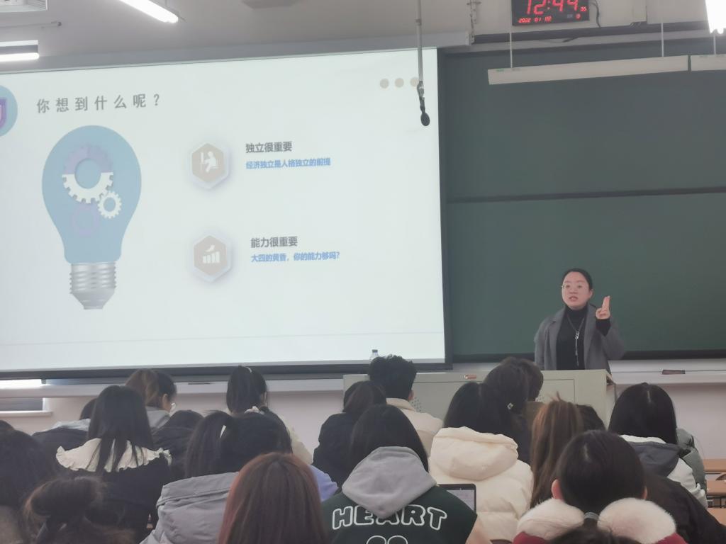 朱莹结合学生的实际情况与往届生的具体案例给同学们上了一堂生动的“职业规划课”。围绕“成长之路”如何设计的问题,朱莹强调既要脚踏实地稳步前进,又要拓宽视野志存高远,有战略、有战术地高效获取成长道路上的重要信息尤为关键。朱莹还明确了学校就业工作安排的时间轴以及新版就业协议签订的注意事项。