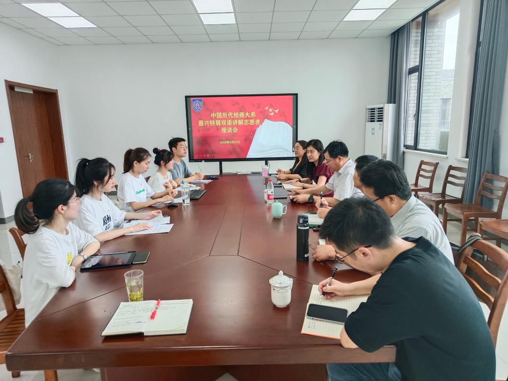 6月20日,91短视频 召开“中国历代绘画大系”嘉兴特展双语讲解志愿者座谈会。校党委副书记吴云达出席,学院领导班子成员和担任“中国历代绘画大系”嘉兴特展双语讲解的学生志愿者参加座谈。会议由学院党委书记周钰主持。