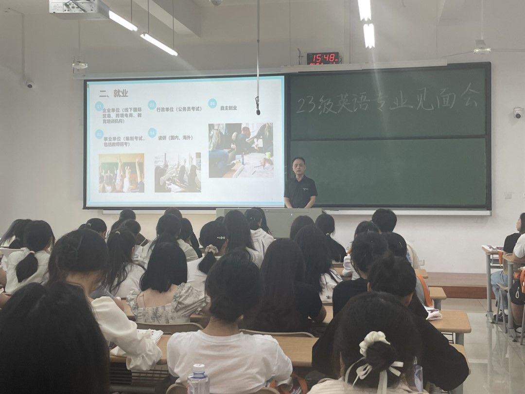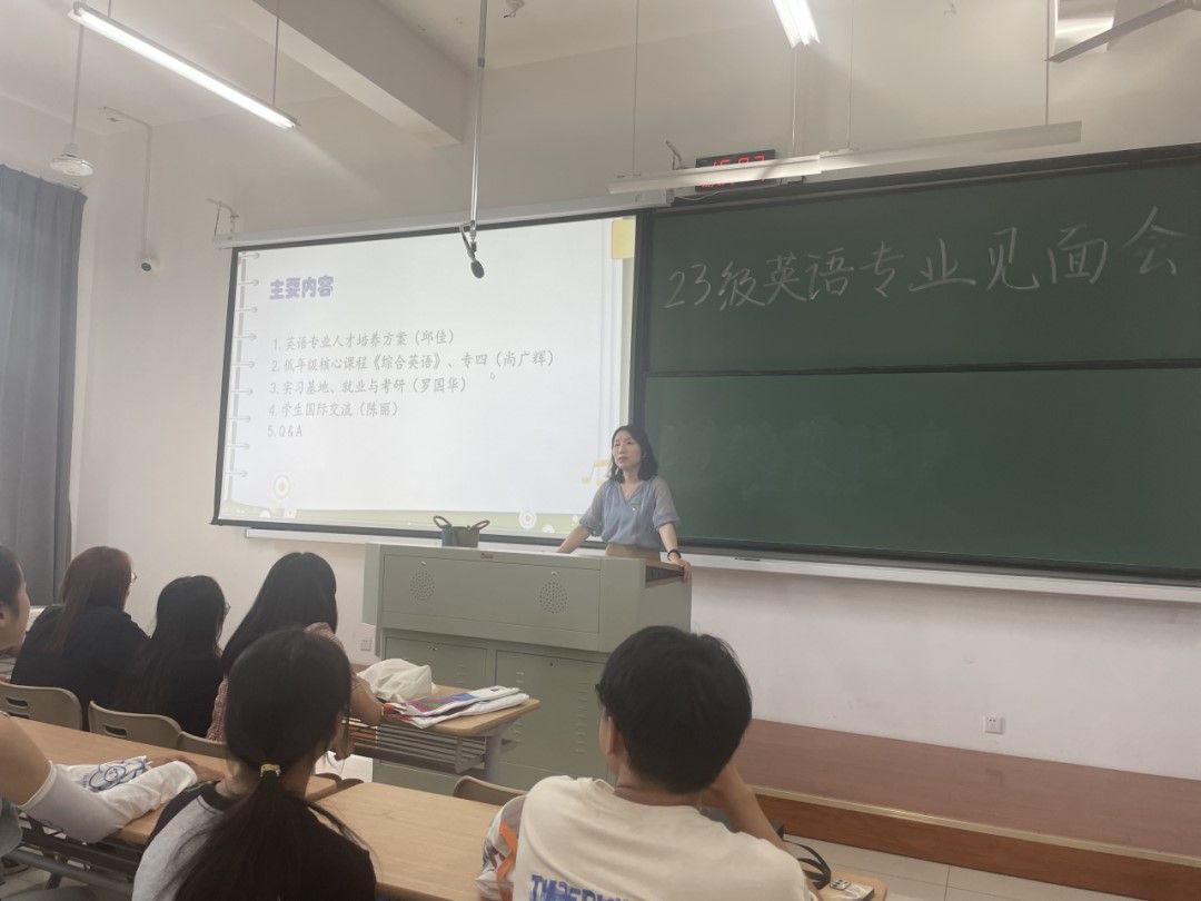 又是一年开学季,正是橙黄橘绿时。美丽的嘉院迎来了90位来自祖国四面八方的英语专业新生。他们怀揣梦想,带着憧憬,走进91短视频 ,开启了新的人生之旅。为帮助新生更快适应大学生活,2023年9月10日下午,英语系在兴德楼123举办2023级英语专业新生见面会。会议由英语系主任邱佳博士主持,英语系尚广辉老师、陈丽老师、罗国华老师等出席。他们从人才培养方案、基础英语学习、专业等级考试、实习就业、考研留学等方面与新生做了面对面交流。