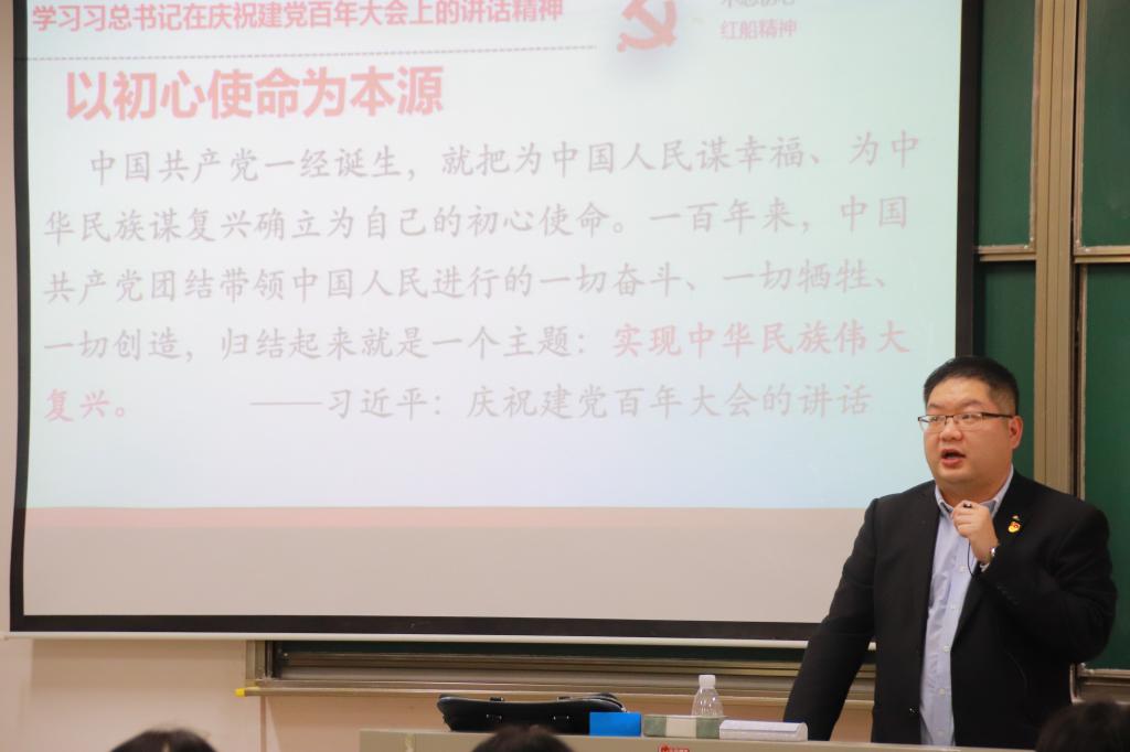 邱老师带领全体同学学习了习近平总书记在庆祝建党百年大会上的重要讲话精神,阐述了“七一”重要讲话的主要观点,着重介绍了建党精神的内涵与历史地位。随后,邱老师结合个人及所在团队的研究成果,以及时政热点,就红船精神的形成与内涵、建党精神与红船精神的关系、中共早期组织成员名录、中共一大南湖会议等问题进行了解读。