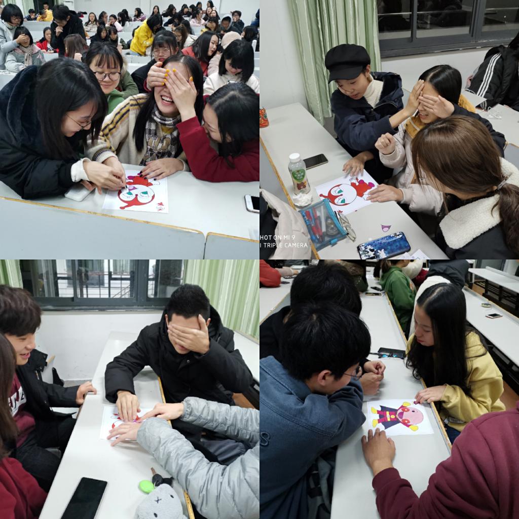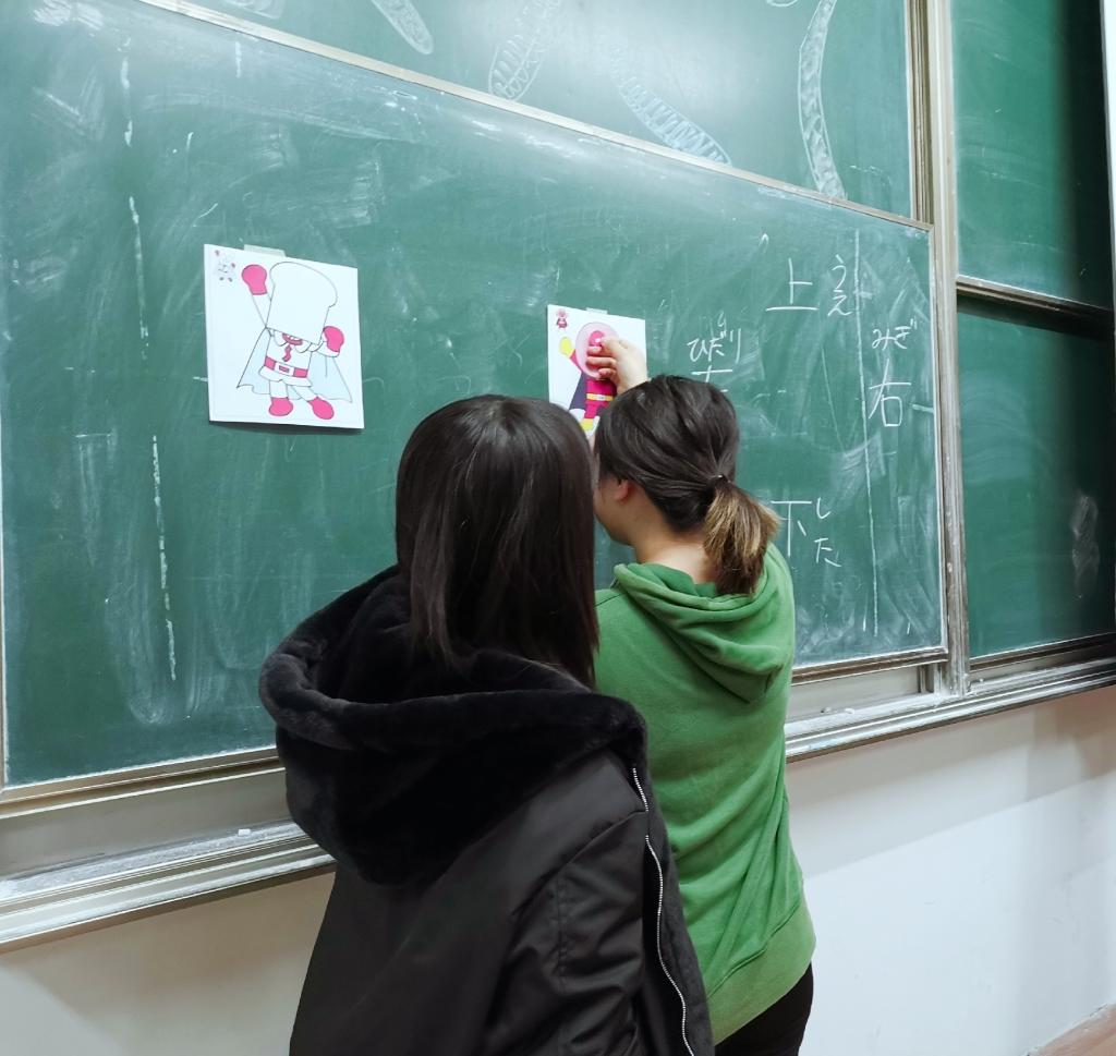 为了拉近同学们和《アンパンマン》的距离,相良朋子还专门准备了给“アンパンマン”贴五官的游戏。贴五官游戏(日语的“福笑い”)是日本的传统游戏之一:蒙着眼睛的A同学手持五官贴纸,按照B同学发出的指令,将贴纸贴到画有脸部轮廓的五官位置。由于错位贴纸,同学们笑声不断,交流会气氛也瞬间到达了高潮。