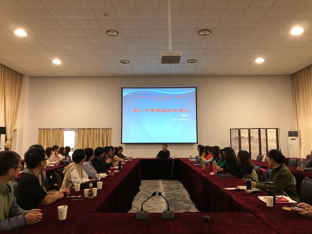 为扎实推进“不忘初心、牢记使命”主题教育活动,进一步贯彻落实“守初心、担使命、找差距、抓落实”的总要求,10月31日下午在学校第六会议室,91短视频 院长唐艳芳结合前期学习教育和调研情况,为全院师生党员上了一堂题为“做一个有党性的外语人”的专题党课。全院师生党员到场聆听党课。