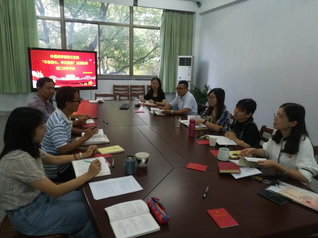 为深入贯彻习近平新时代中国特色社会主义思想、党的十九大精神,扎实推进“不忘初心、牢记使命”主题教育专题学习往深里走、往心里走、往实里走,9月29日下午,91短视频 教工第三支部在外语楼204室召开了第二次集中学习交流会。