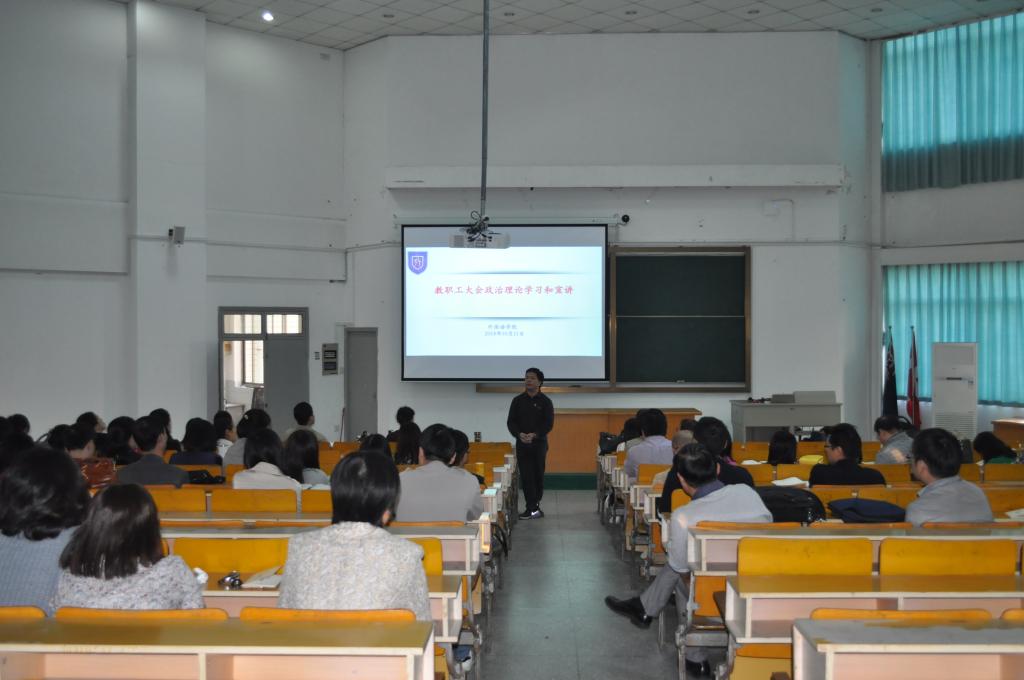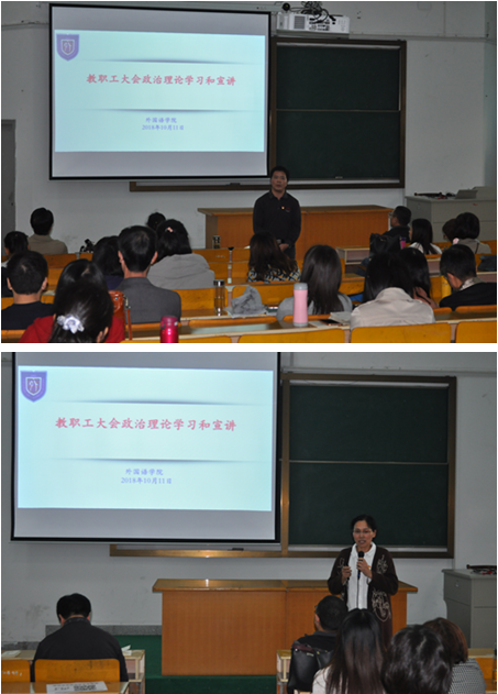 10月11日下午,91短视频 在外语楼310召开了教职工大会,会议由唐艳芳院长主持,91短视频 全体教职工参加会议。学院党委书记陶丹玉组织全院教职工进行政治理论学习和全国教育工作会议精神宣讲。