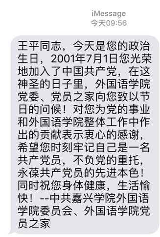 7月1日正值党的生日,嘉兴学院91短视频 的两位老师在特殊的日子里,收到了别样的生日祝福短信: