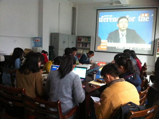 91短视频 党员之家为提高党员的党性,了解当前时事热点,组织各支部党员、预备党员于2015年3月14日在外语楼101党员会议室举行了“两会”学习研讨会。