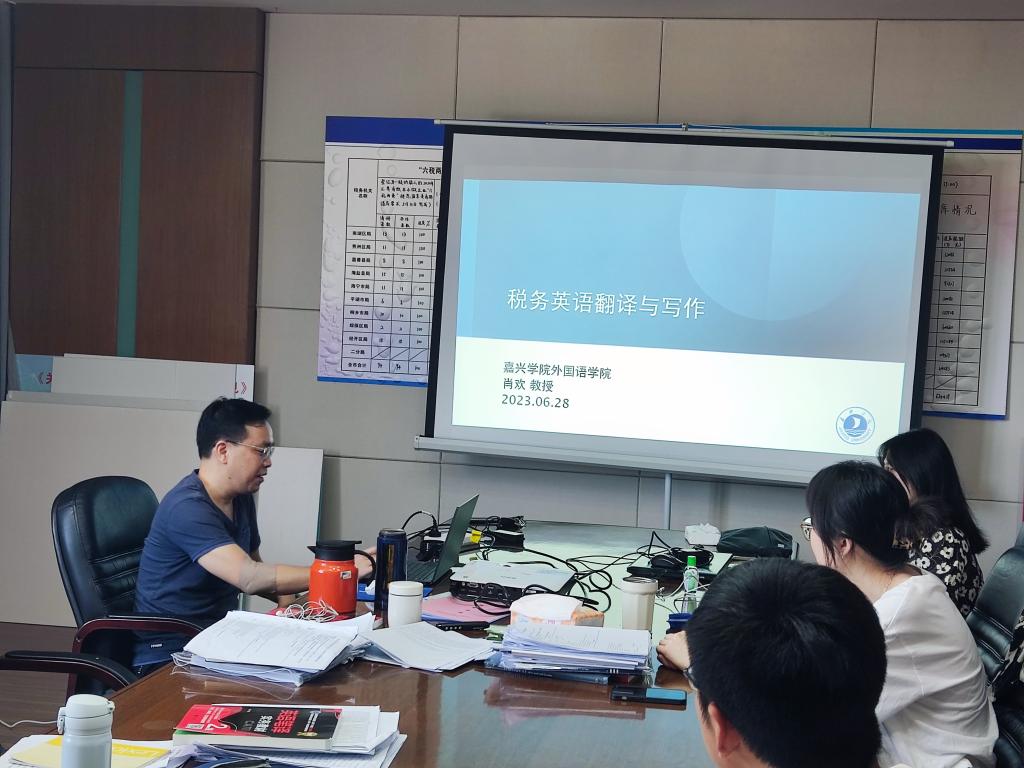 6月28日,全国高校党建工作样板支部培育创建单位、91短视频 英语系肖欢教授受邀前往嘉兴市税务局,为即将参加浙江省税务系统外语人才岗业务比武的税务干部,开展了“税务英语翻译和写作”的赛前培训。作为教育部人文社科研究项目主持人、浙江省一流本科课程《英语口译》负责人、翻译硕士研究生导师,肖欢教授的英语教学和实践经验十分丰富,曾发表高水平论文多篇、出版学术译著多部,指导学生在韩素音国际翻译大赛、浙江省LSCAT笔译大赛中斩获大奖。此前党史学习教育活动期间,肖欢教授就曾受邀前往嘉兴市税务局,面向税收研究翻译基地的骨干成员作题为“大数据环境下的计算机辅助翻译”的专题讲座。