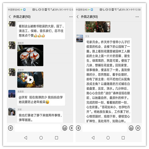 群里越来越情绪高涨,连男士们也兴致勃勃参与进来,大秀特秀自做的包子和与宠物狗抢美食的生动情景。晒着晒着大家不知不觉就PK起来,在互赞互评中把活动推向高潮,期间不乏好奇者的发问和好师者的趣答,因而“挖掘”出图片和视频背后一个个有趣的故事,交流着健康生活的智慧,分享到积极豁达的生活感悟。还穿插着院领导的温馨祝福和男同事的热情鼓励,女神们倍感集体的温暖。