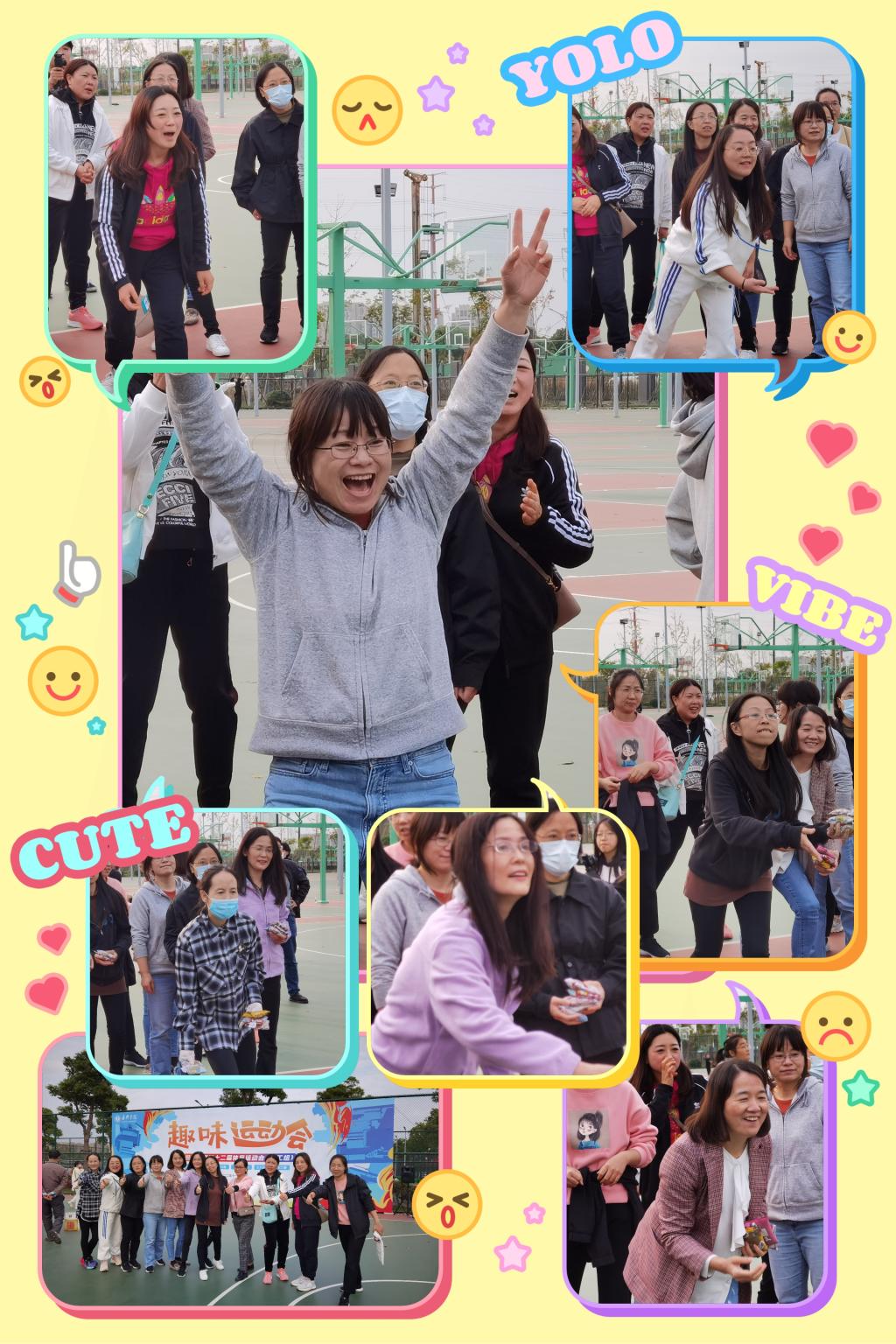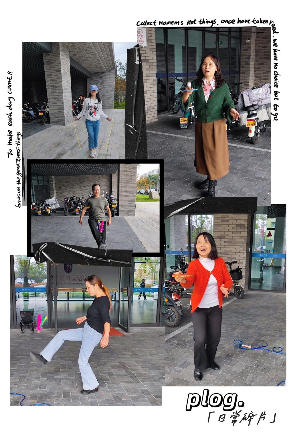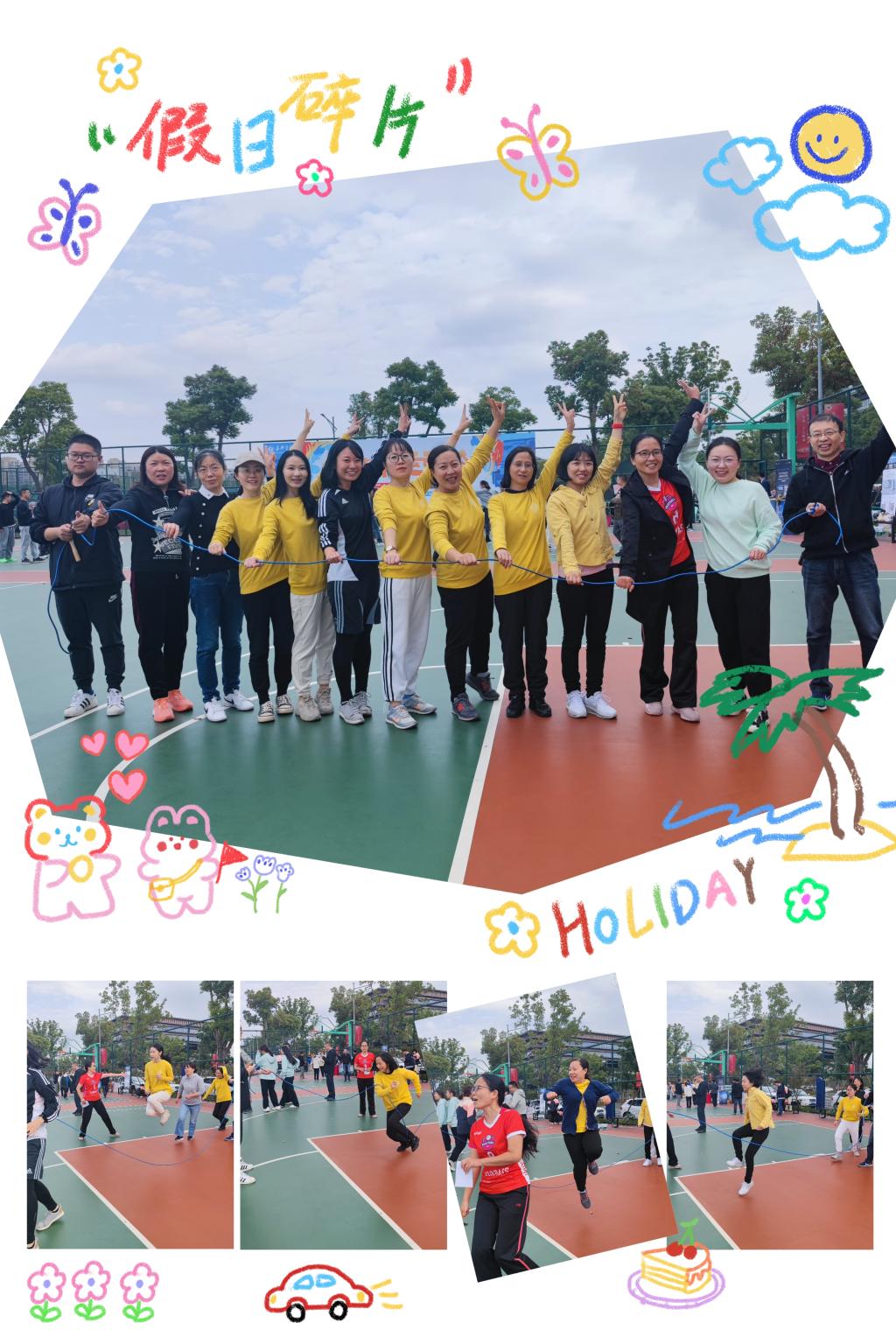 11月4日上午9点校教职工趣味运动会在梁林二期篮球场准时举行。因为除了集体跳长绳这个传统项目外,今年趣味项目都是新项目,老师们既期待又紧张。上午9点第一项是“20米身手敏捷接力”。5位男老师和5位女老师组成的接力队分别要在三个区域完成“跳绳”“踢毽子”和“弯腰旋转三周”。赛场外,91短视频 学生啦啦队早已蓄势待发,一声令下篮球场顿时沸腾了起来。下午2点开始传统项目“跳长绳”比赛,由2位男老师负责甩绳,10位外院女将跳长绳。在灿烂的阳光中10位女老师秒变快乐的音符,演奏出了一曲维瓦尔第协奏曲——《和谐的灵感》。