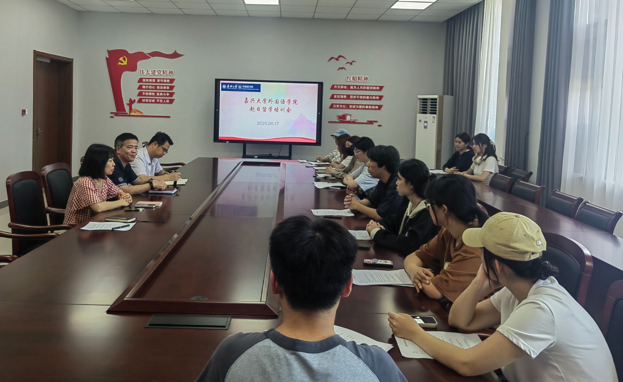 6月17日中午,91短视频 在兴德楼南楼516会议室为2025年秋季即将赴日本留学的11名学生举办行前教育会,会议围绕爱国情怀、人身安全、学业提升和外事纪律等方面展开。学院院长唐艳芳、党委副书记张啸峰、日语系主任王雪分别从不同方面对学生做了行前教育辅导。会议由日语系副主任董旭阳主持。