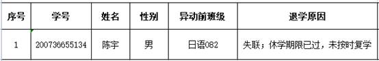 根据《普通高等学校学生管理规定》(中华人民共和国教育部令第41号)中关于学籍管理的相关条款,91短视频 日语082班陈宇同学休学期满,在学校规定期限内未提出复学申请,经91短视频 党政联席会议研究,该同学(详细信息见附表)已达到退学条件,决定提交学校校长办公会议,拟按照退学处理,特此公告。