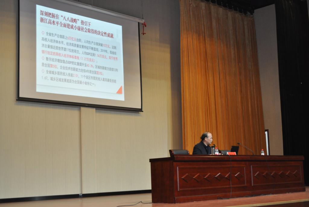 杨培强副校长围绕从历史和全局的高度深刻认识党的十九届五中全会的重大意义、深刻领会党的十九届五中全会的丰富内涵和精髓要义、深入学习贯彻中央和省委决策部署,谋划实施好学校未来发展蓝图等三个方面,深刻阐述党的十九届五中全会精神。他结合习近平总书记考察浙江重要讲话精神、省委和市委全会精神以及学校第四次党代会精神,深入宣讲我校忠实践行“八八战略”、奋力打造“重要窗口”中最精彩高等教育板块的生动实践。
