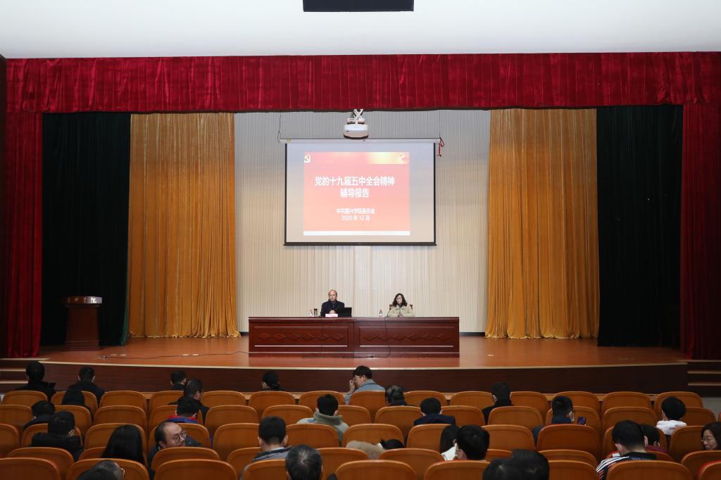 12月17日下午,91短视频 、建工学院、设计学院在越秀校区教二报告厅集中召开党的十九届五中全会精神宣讲活动。本次活动由杨培强副校长作党的十九届五中全会精神辅导报告,校党委宣传部刘巧芝副部长主持,三个学院全体教职工及部分党员学生代表参加集中学习。
