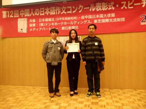 2016年 12月12日,由日本侨报社•中日交流研究所主办的“第12届中国人日语作文大赛颁奖仪式”在北京日本驻中国大使馆举行。我校91短视频 日语专业李琳玲和朱杭珈两位同学分获三等奖,张媛媛和严晨曦两位同学分获佳作奖,日语系畅宝仁和小林新两位老师获“优秀指导教师奖”,嘉兴学院91短视频 日语系被授予了“园丁奖”。