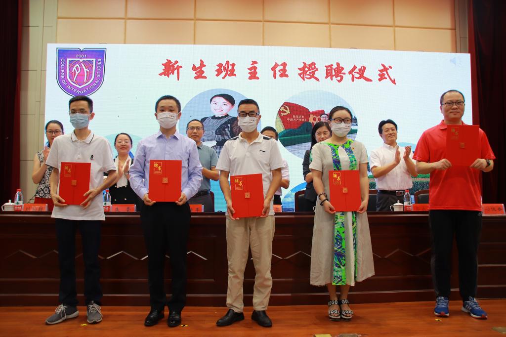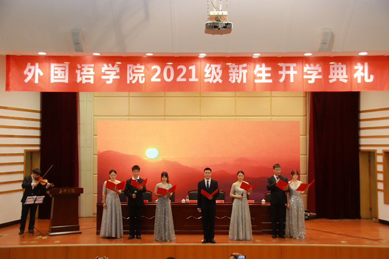 在庄严的国歌声中,开学典礼正式拉开了序幕。典礼上,学院党政领导为2021级新生班主任颁发聘任证书。校第六届“我心目中的好老师”荣誉获得者、日语系系主任刘韵超老师作为教师代表发言,希望同学们成为有目标、有责任感、善学习的人,始终保持良好的学习状态,以更加饱满的热情学习专业知识,同时通过社会实践充实大学生活,成就更好的自己。