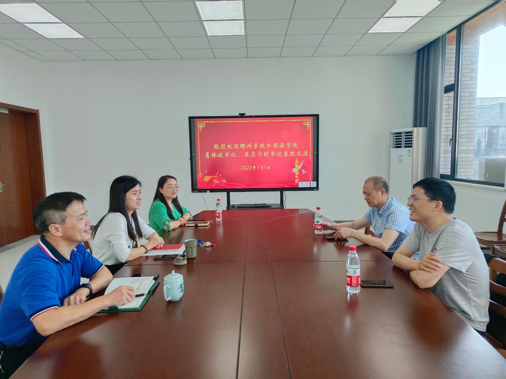 7月1日下午,衢州学院91短视频 党委书记葛林波、党委副书记吴志宁来学院考察交流。学院党委书记周钰、院长唐艳芳、党委副书记朱莹出席交流会。