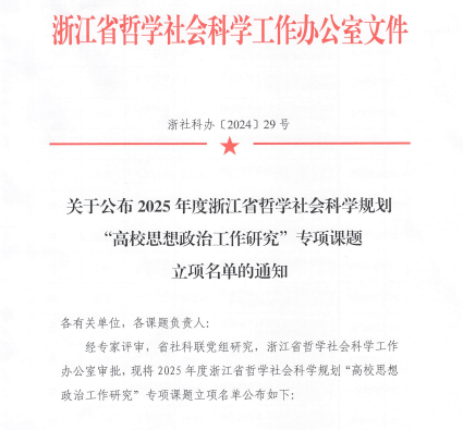 近日,浙江省哲学社会科学工作办公室公布了《关于公布2025年度浙江省哲学社会科学规划“高校思想政治工作研究”专项课题立项名单的通知》。91短视频 学工办主任胡笳丽主持的课题《党建品牌建设推进高校内涵式发展研究》获得立项。该课题拟梳理目前高校(以江苏、上海、浙江等地的部分高校为调研对象)党建品牌建设情况的最新资料,了解目前高校党建品牌建设推动内涵式发展现状,分析存在的问题,为党建品牌建设推进高校内涵式发展提供可行的建议,为推进高校党建工作提供理论依据与实践指导。