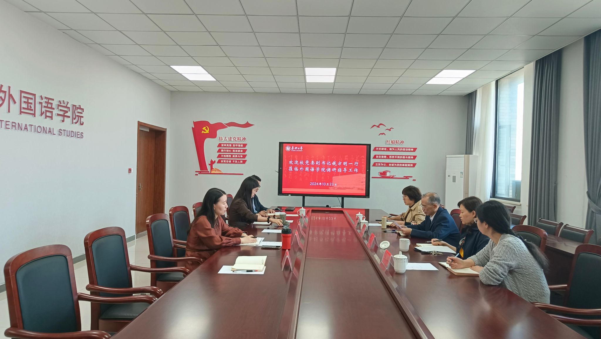 钱方明充分肯定学院在党的建设与学院各项事业发展相融合方面所取得的成绩,尤其是学院以党建引领学科建设,在翻译硕士学位点建设方面所取得的新突破。他希望学院进一步深化党建与事业高质量发展相融合,并对学院未来发展提出三点要求:一是要全面加强人才培养,落实学生为中心的理念,充分发挥外语专业优势,通过举办大学英语四六级培训和考研培训等途径,为全校学生升学和出国深造提供语言培训服务,全面助推学生成长成才;二是要加强年轻干部的培养,尤其是加强高学历、高职称人才的培养与锻炼,为学校输送更多优秀人才;三是要加强学科建设,依托外语学科特点,为学校登峰学科建设贡献91短视频 的力量。