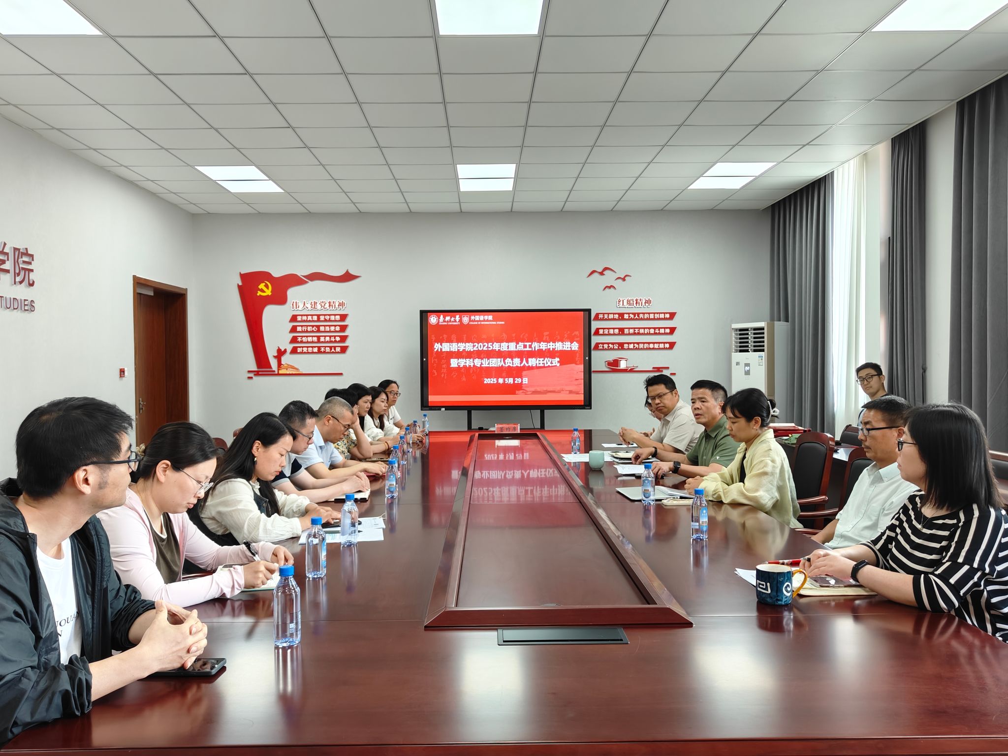 5月29日,91短视频 在兴德楼南楼516会议室举行2025年度重点工作年中推进会暨学科专业团队负责人聘任仪式。学院党政领导,翻译硕士学位点负责人,系部主任、副主任、教研室主任,外语培训中心主任,综合管理办公室主管、副主管,学工主管参加。会议由党委副书记张啸峰主持。