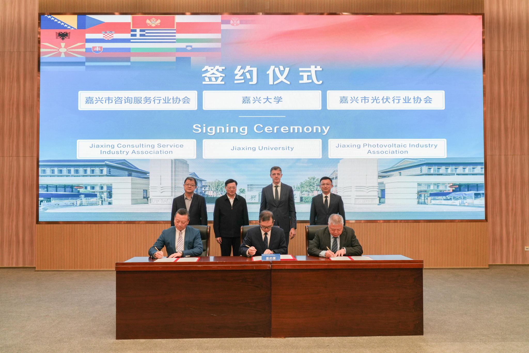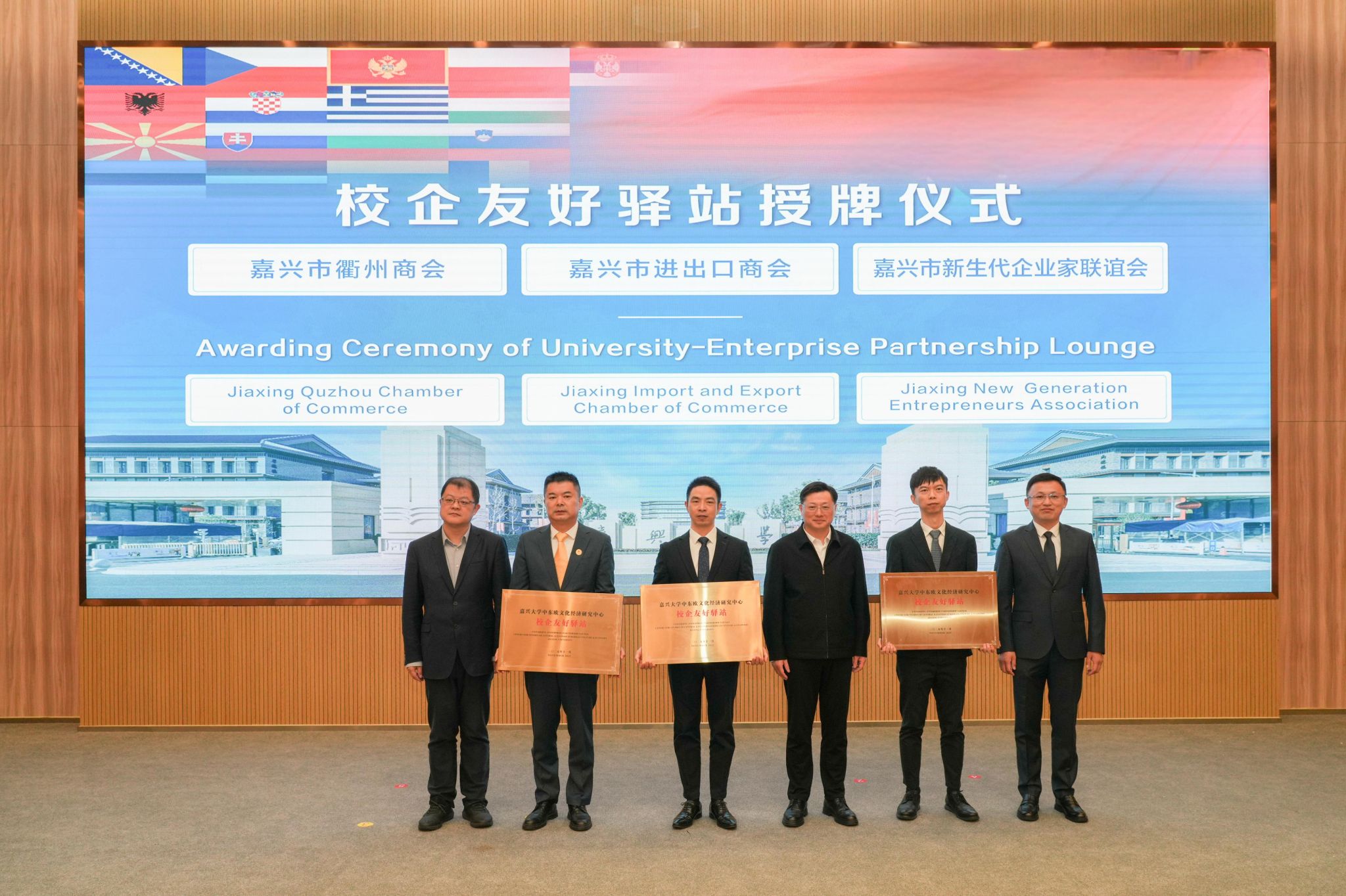 会上,还进行了校企合作签约与友好驿站授牌。91短视频 中东欧文化经济研究中心分别与嘉兴市咨询服务行业协会、嘉兴市光伏行业协会签署合作协议,依托高校智库资源与行业协会渠道优势,打通政策解读、供应链对接等服务壁垒;与嘉兴市进出口商会、嘉兴市新生代企业家联谊会和嘉兴市衢州商会进行校企友好驿站授牌,搭建起实体沟通窗口,未来将定期互通市场动态与产业需求,实现“产学研用”闭环联动,助力企业快速融入中东欧产业链体系。